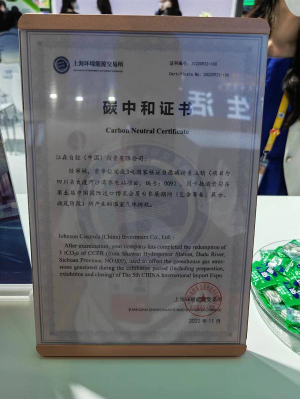 The reporter noticed that a "Carbon Neutralization Certificate" of Shanghai Environment and Energy Exchange was also placed on the booth in johnson controls. The greenhouse gas emissions generated during the preparation, exhibition and closing stages of China International Import Expo(CIIE)’s exhibition have been offset by the voluntary emission reduction of 3 tons through the Shawan Hydropower Station project in Dadu River, Sichuan Province, and the carbon neutrality goal has been achieved.